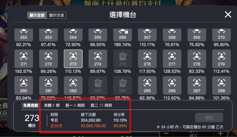 在選擇戰神賽特機台前,可以先查閱該機台在過去24小時及30天內的投注金額與得分率數據。得分率位於100%至110%的機台,通常代表著運行穩定且適合長期投注,這類機台正是「養分」機台的首選。
