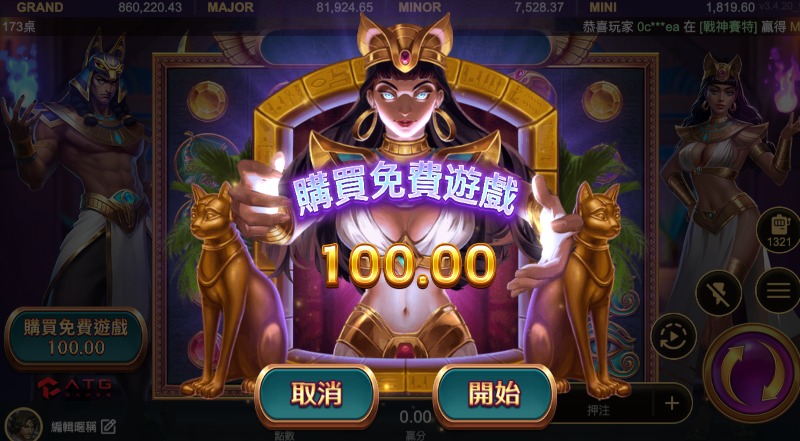 • 可購買獎金遊戲:玩家可選擇以當前注額的100倍購買免費遊戲,點擊開始後,由勝利女神帶領進入神秘金字塔,盡收古埃及寶藏。